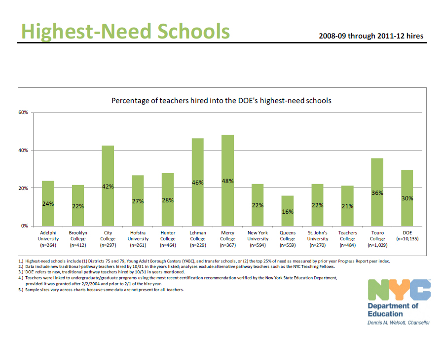 Because of a small sample size of teachers from each institution, the New York City Department of Education recommended interpreting the data cautiously. Unlike NCTQ, the DOE report, which uses data from the last four years, shied away from assigning ratings to schools and in some cases, programs differed starkly on how they fared on each measure. For instance, just 16 percent of QueensCollege graduates go into the city’s highest need schools, the lowest percentage among all the programs. But the school boasts the second highest retention rate with 92 percent of teachers still in the classroom after three years.