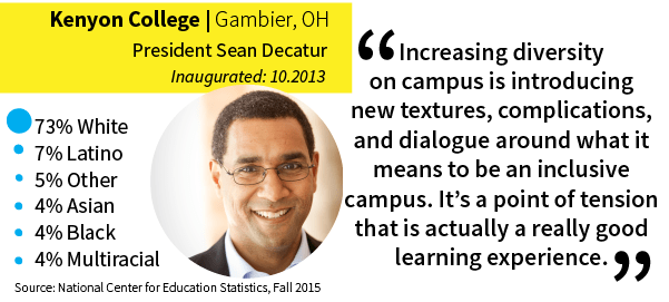 Kenyon President Sean Decatur says the school is taking important steps, scouting for high-achieving students from backgrounds less represented on campus and inviting them to Kenyon for a weekend at the college’s expense.