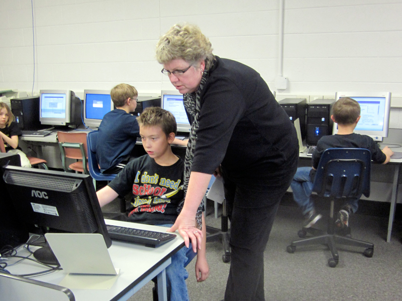 Walking around the computer lab, Palen knows exactly how her fourth-graders are doing as they work through a 10-question practice test to prepare for the approaching state exams.